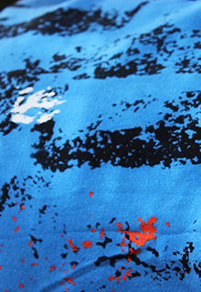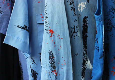 Série de vetements de seconde main sérigraphiés en noir, blanc et orange.