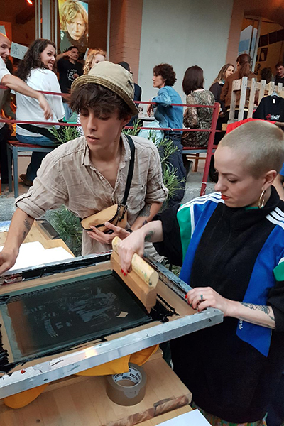 Lors de festivals, expositions, concerts... l’atelier de sérigraphie se déplace et monte un stand sur place.Nous vous proposons d’imprimer à la demande et en direct le visuel de l’événement. Ramenez votre tee-shirt, chemise, pull... ou servez-vous dans notre stock de seconde main et repartez quelques minutes plus tard avec une toute nouvelle fringue pour votre garde-robe.Et tout ça à prix libre!Vous aurez aussi l’occasion de vous procurer nos créations originales, vêtements, affiches... réalisés en collaboration avec des artistes de tous bords.